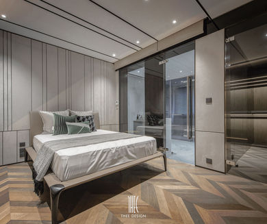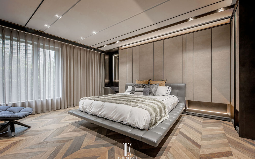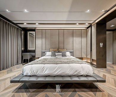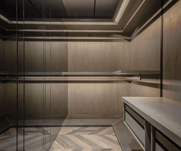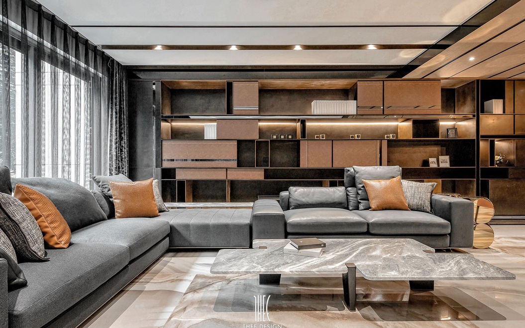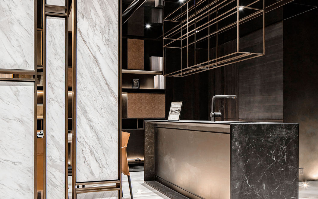 空間中以多樣性金屬/岩板/古銅/皮革等精奢面材做表面材質