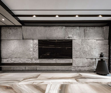 電視牆面則是以粗曠而雅致的石皮來打造出整面恢弘氣勢感受